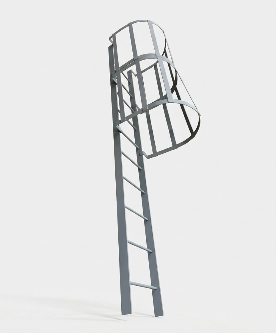 The ladder is constructed using heavy 3/8″ x 3″ steel flat bar for the side rails, ensuring a rigid frame that won’t flex or twist. The upper portion includes a protective safety cage to meet standard facility requirements for higher-level roof access.