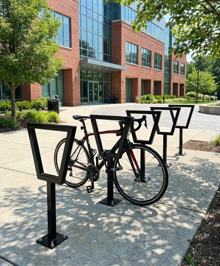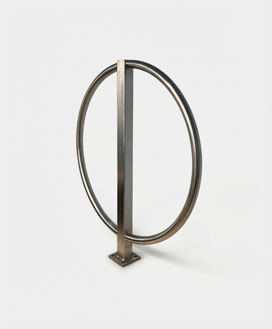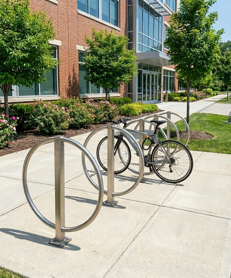 The circular “Style D” design allows for two points of contact with the bicycle frame, keeping bikes stable and upright while allowing locking via U-lock or cable. The premium brushed stainless steel finish not only looks modern and architectural but also provides natural resistance to rust and corrosion, making it perfect for Northeast winters or coastal environments.